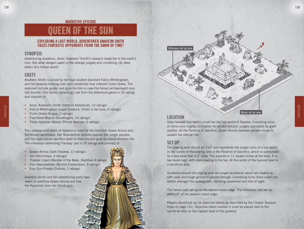 The 7TV Core Rules provide six “open play” scenarios that set up a variety of basic, objective-based games such as rescuing a captive, escaping from the other player’s territory, or racing to be the first to collect a macguffin (objective token) and hold onto it until the end of the game. But the real strength of 7TV is in Narrative Episodes, scenarios which provide not just game objectives but also specific casts and board setups, allowing a much more story-based approach to the game. Casts are often asymmetrical, with one side having more ratings worth of characters but perhaps a more difficult objective, in line with the story the game wants to tell.The Core Rules include three such episodes, depicting a James Bond-style spy thriller, a pulp adventure, and a historical fantasy featuring Robin Hood and his band of outlaws facing off against a demon-summoning sorcerer right out of a Hammer horror film. Additionally, Crooked Dice publishes a range of Feature Packs that detail multi-part campaigns across a wide variety of genres, everything from Lovecraftian horror to heroic fantasy to small towns menaced by supernatural forces. In addition to new character profiles and game scenarios, feature packs will usually include bespoke script cards to make the game’s countdown mechanic more specific to the story being told.