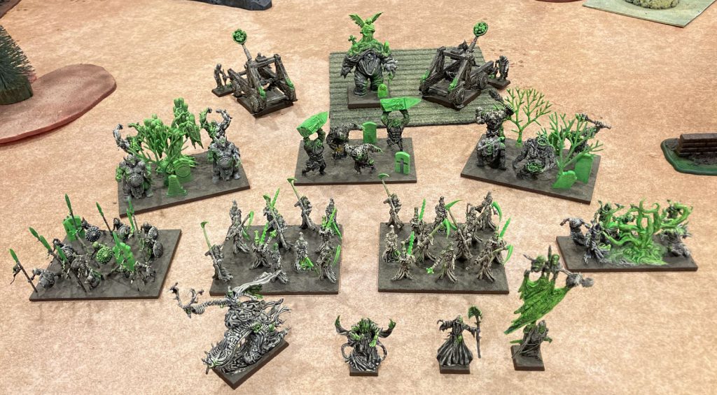 1 x Skeleton Spearmen (regiment) 1 x Wraiths (troop) 2 x Wraiths (regiment) 3 x Zombie Trolls (horde) 2 x Balefire Catapult 1 x Goreblight 1 x Necromancer – Aura (Vicious – Zombies), Surge (6), Weakness (2) 1 x Necromancer – Undead Horse, Inspiring Talisman, Surge (6), Drain Life (4) 1 x Undead Army Standard Bearer – Tome of Darkness 1 x Mhorgoth the Faceless