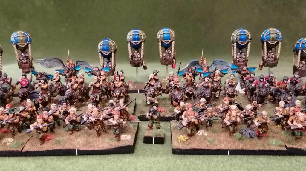 2 x Halflings Rifles (Horde) 2 x Ej Grenadiers (Regiment) 2 x Wild Lancers (Regiment) 2 x Wild Runners (Regiment) with Blackpowder Weapons 3 x Aeronauts (Regiment) 1 x Engineer with Radiance of Life (Tinker only), Halfling Long Rifle and Gadgets and Gizmos 1 x Muster Captain on Winged Aralez with Relentless and Chalice of Wrath 1 x Muster Captain on Winged Aralez with Relentless and Staying StoneJP: Halflings are a new army. Many people are still figuring out how they work. What made you pick Halflings for Clash of Kings?