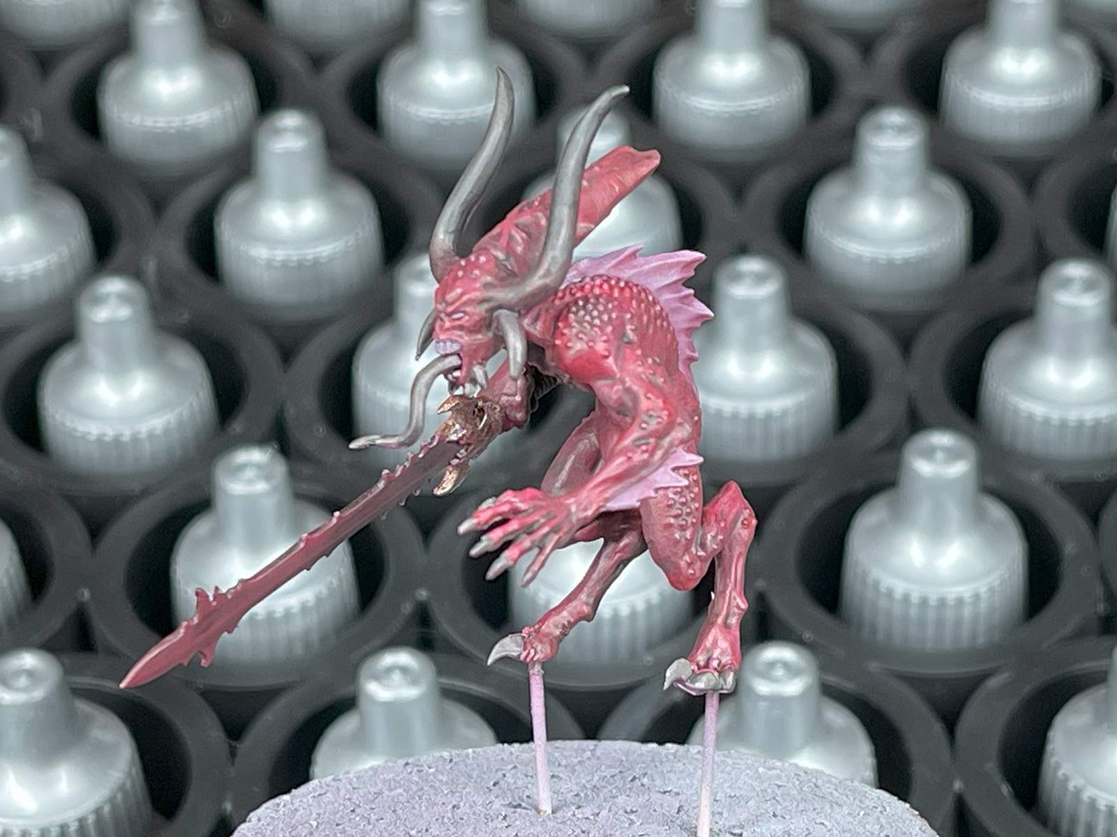 Credit: PendulinNothing fancy here, just a good ol' stabby Bloodletter. This guy is painted almost exclusively with just two colors. Slaughter Red all over, Noble Skin on the horn, tongue, and claws. And then a blend of both, along with a healthy dose of Speedpaint medium, to make a quick glaze for the whole model.