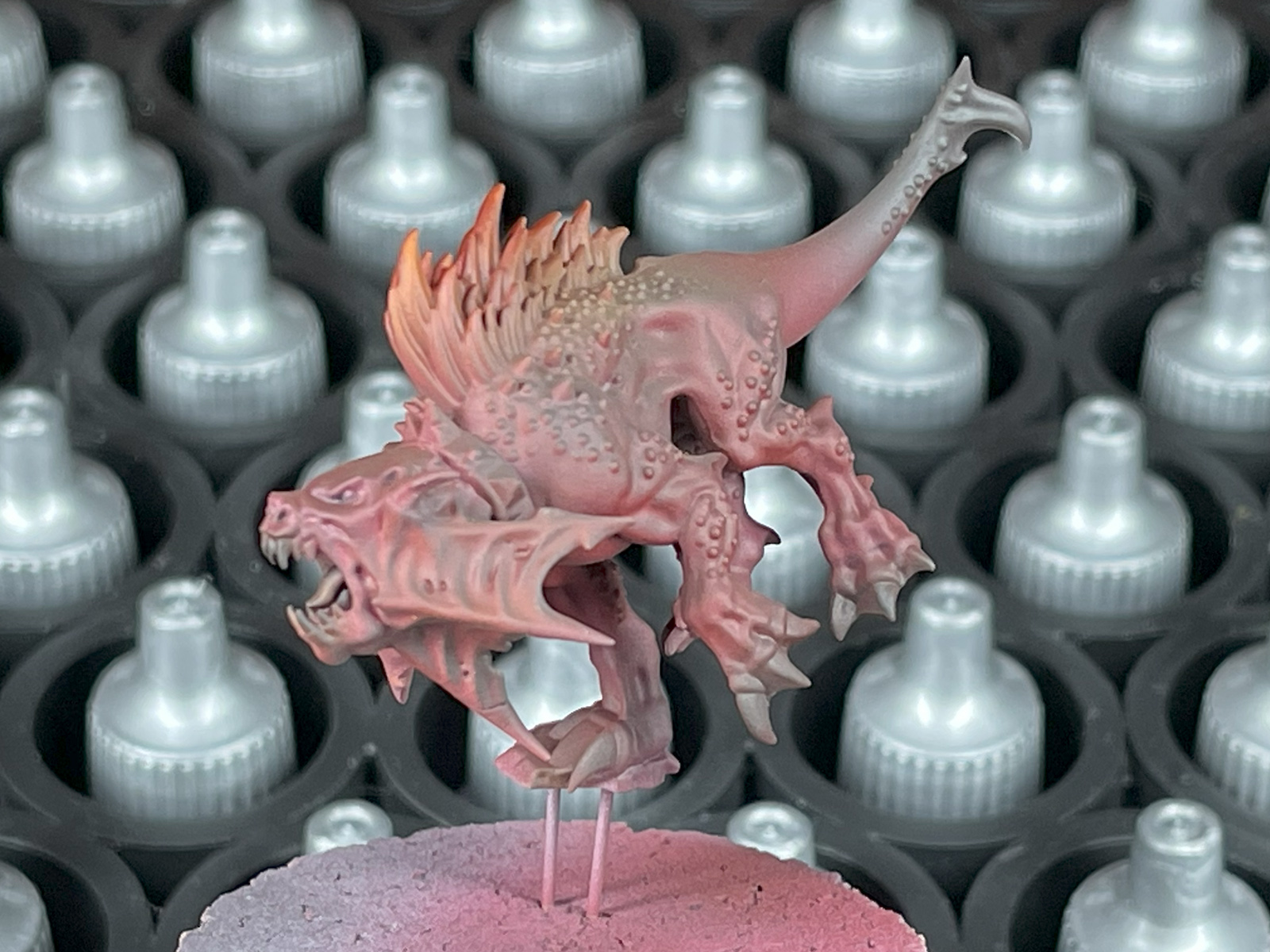 Credit: PendulinThis was a handful of different colors: Murder Scene, Slaughter Red, Carmine Dragon, Nuclear Sunrise, and Noble Skin. Probably others too, as I wasn't following any plan in particular. I was just grabbing the paints that looked about right, and trying stuff out.