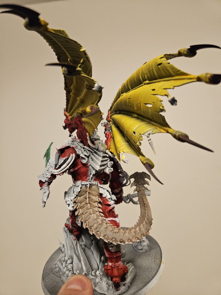 First off, you'll notice his wings are loud and announcing his bloody pressence. At first, I thought this was going to be a bit overpowering but as I put the paint on, I enjoyed the color more and more. Maize Yellow made painting one of my most hated colors a breeze, and it was applied so evenly that I can't imagine using something else. For the bone of the tail and his wings, you'll notice my beloved Bony Matter paint at work again. His skin I was planning on using Khorne Red, but then I saw the Slaughter Red paint decided to give it a go. It's dark and easy to look at, a great color for his skin. His weapons I'm still trying to decide on, but i landed on the Forest Sprite green to start the glow of his Daemonic Sword.