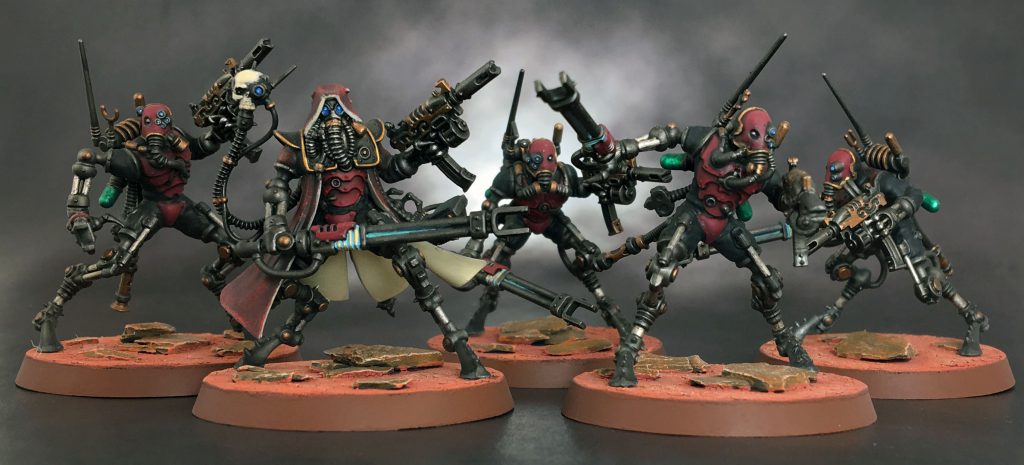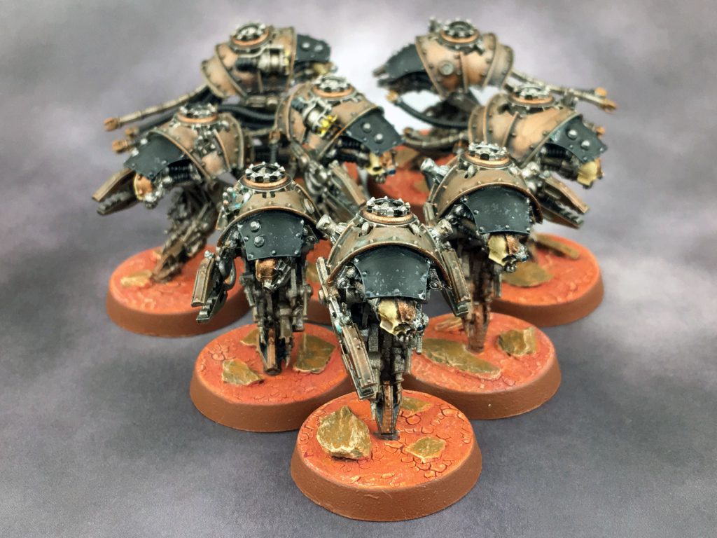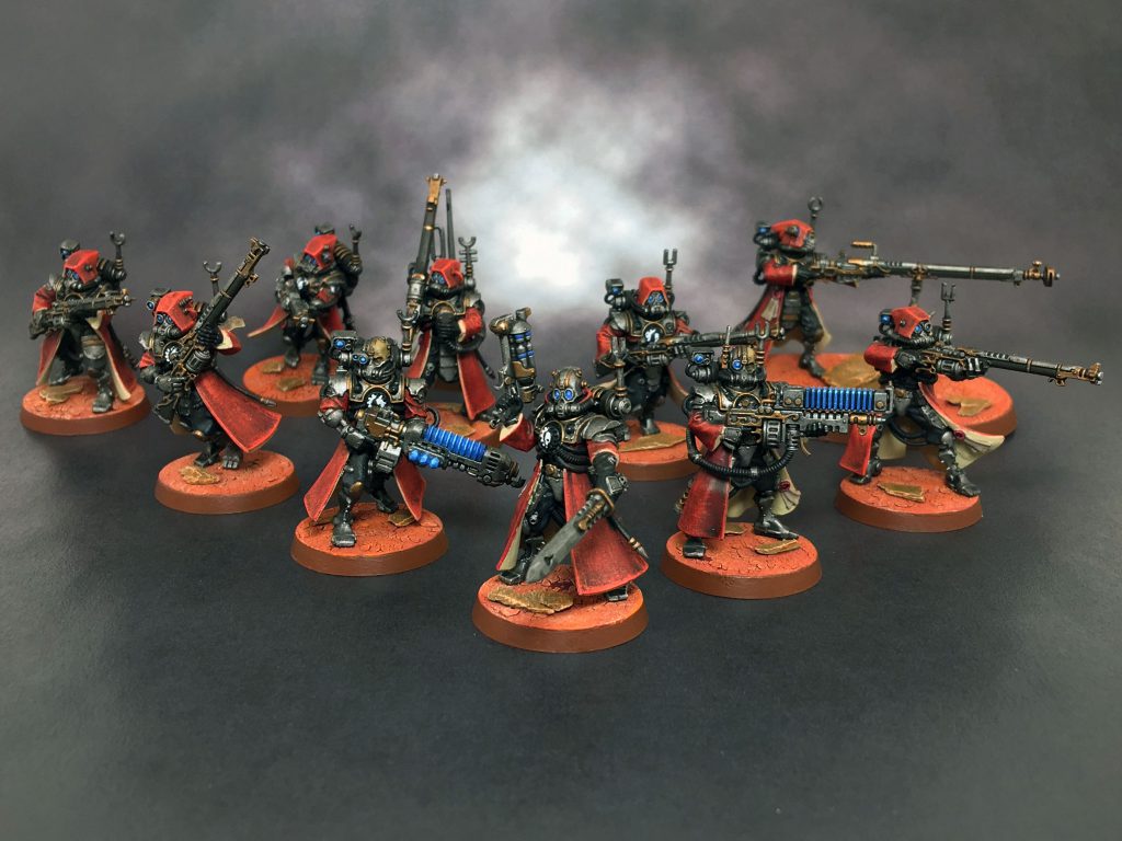 Fun Fact: These eight Servitors are literally the only 40k models I have ever painted without using the color red.I got these five Sicarian Infiltrators (and still plan to get another five) when I learned you could deep strike them in, pop Wrath of Mars and Protector Doctrina Imperative, and deal an average of 7 mortal wounds to their Warlord if it's left exposed.