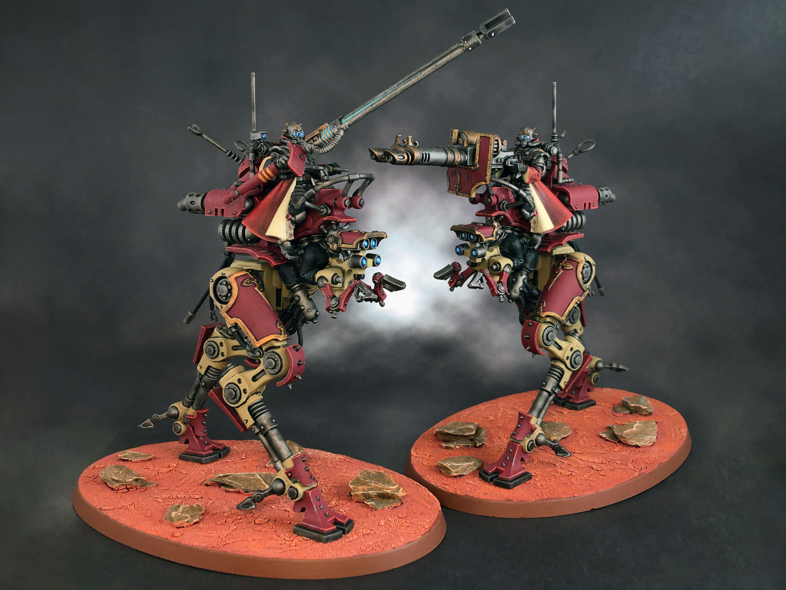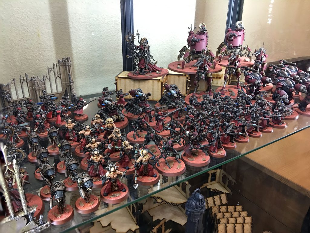 My robobois waiting for battle in their Ikea display cabinet home.I'm now sitting at around 2400 points of Admech, with over a quarter of those points coming from six Kastelan Robots. Initially, I hated the robots. That goofy face on top of a 60's era lumpy body just didn't resonate with me. Fortunately, I found some third-party heads and pauldrons which completely changed my opinion on the model. With an upper body closer to the Castellax Automata, they're now among my favorites. I've not yet played a game with all six of them on the battlefield, but I'm looking forward to the first time I declare the target of my shots and reach for one hundred and eight (108) dice. Given that they'll be parked next to Cawl and rerolling any hit rolls I don't like, I expect that single salvo to take a solid five minutes to resolve, and for there to be naught but a smoking crater where their target once stood once they're finished.