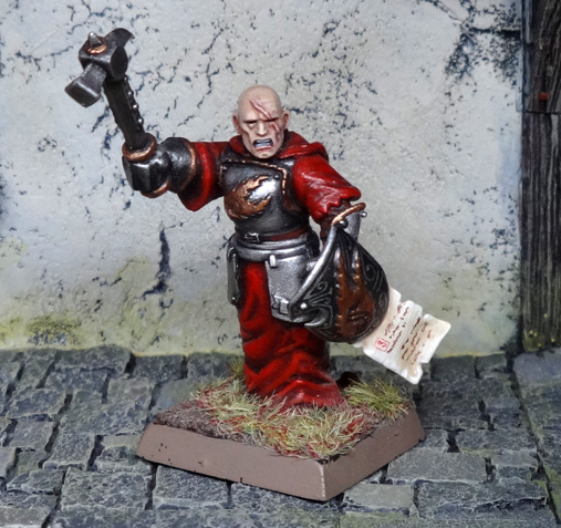 Brother Marten, Empire Warrior Priest of Sigmar. Credit: Charlie BrassleyBrother Marten This converted Warrior Priest is cobbled together from various bitz. The head, torso and legs are from the Greatswords kit, but with a skirt and hoot sculpted from green stuff. The arms are from the Knightly Orders kit, with a shield from the State Troops box.