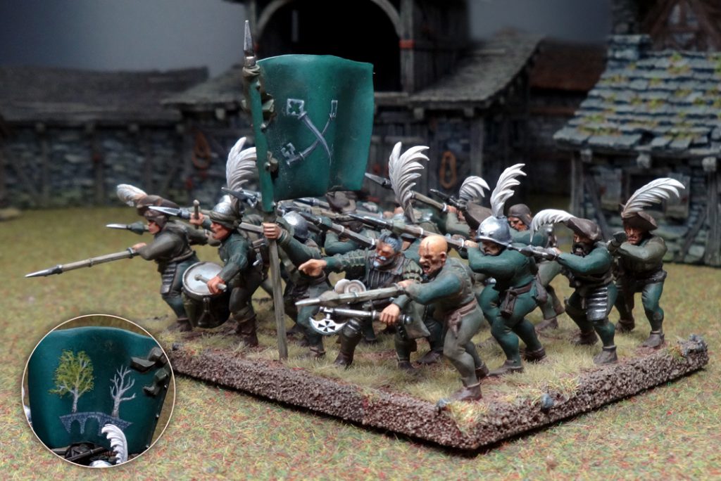 Empire Spearmen of Hochland. Credit: Charlie BrassleyThe Heedenhof Greenleaves This regiment was founded during the Hochland campaign when the neighbouring town of Bergendorf was overrun by Emma’s Beastmen army. They had little steel and no red dye to hand, hence spears and purely green uniforms. For their banner, I depicted the bridge that joins the two towns, with the towns themselves represented by trees - one with foliage for Heedenhof, and one leafless to represent the sad fate of Bergendorf. On the flipside of the banner I painted crossed keys, with the keys suggesting city gates, and crossed because that’s a popular Hochland motif. Yes, indeed, I too own a copy of the lovely Uniforms & Heraldry of the Empire.