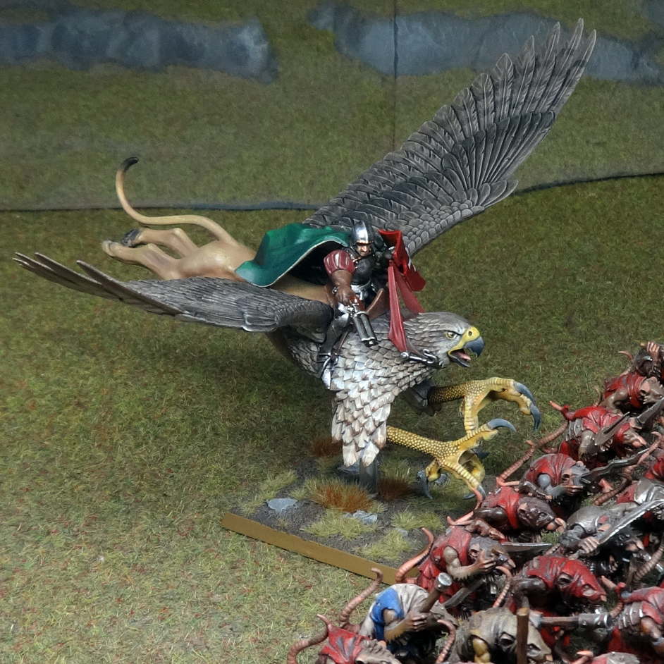 Empire Elector Count Aldebrand Ludenhof on griffon. Credit: Charlie BrassleyCount Aldebrand Ludenhof on Magrit the Griffon This was a conversion that was half-done by my friend Maisey, who’d built a rider and lopped the High Elf off this Island of Blood Griffon. The original rider conversion was fine, but had a beefy face and a big old lance. I imagine Aldebrand Ludenhof - Hochland’s canonical count - to be a wiry man with an enthusiasm for falconry, so I re-converted the rider. Among the details I changed was taking the gaunt face from the Empire Battle Wizards kit and filing it down until it could fit in the spare helmet you get in the Greatswords box.