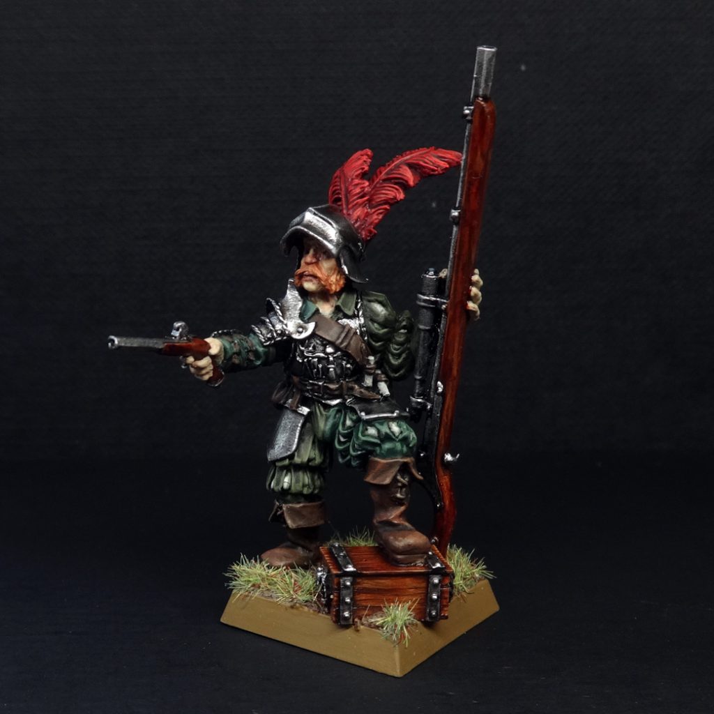 The Powderkegs, Empire Handgunners of Hochland. Credit: Charlie BrassleyThe Powderkegs This was one of the first regiments I made for the Hochlanders, and I was keen to inject plenty of character. Named for their inexperience with their own weapons, the crossbow bolts on their standard hint that, perhaps, the regiment has only recently switched from crossbows to handguns. So recently, in fact, that everyone else in Hochland’s state soldiery thinks of them as an utter liability. Chosen men? Hardly. Not that it stopped me giving them a sergeant with floppy blond hair. Regimental standard bearer and misfire survivor Blind Alfred serves to remind them all of the importance of keeping one’s gun in good working oder.
