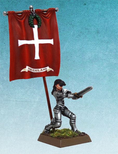 Empire Greatswords of Hochland with alternate command group. Credit: Charlie BrassleyThe Count’s Own/The Weissguard: one regiment, two command groups As the campaign carried on, and Hochland rebuilt its army, I started painting extra command groups so that one blob of miniatures could represent different regiments. As an example, my greatswords have two command groups: one representing the Elector Count’s personal bodyguards, captained by his own cocksure daughter Rikke. With Hergig having fallen during Archaon’s invasion, Tussenhof became the acting capital, hence its name being on the banner. The alternate command group is for the Weissguard, the veteran defenders of Fort Schippel in the eastern Weiss Hills. With West and East thus covered, I could switch which regiment I was using depending on where the battle was taking place.
