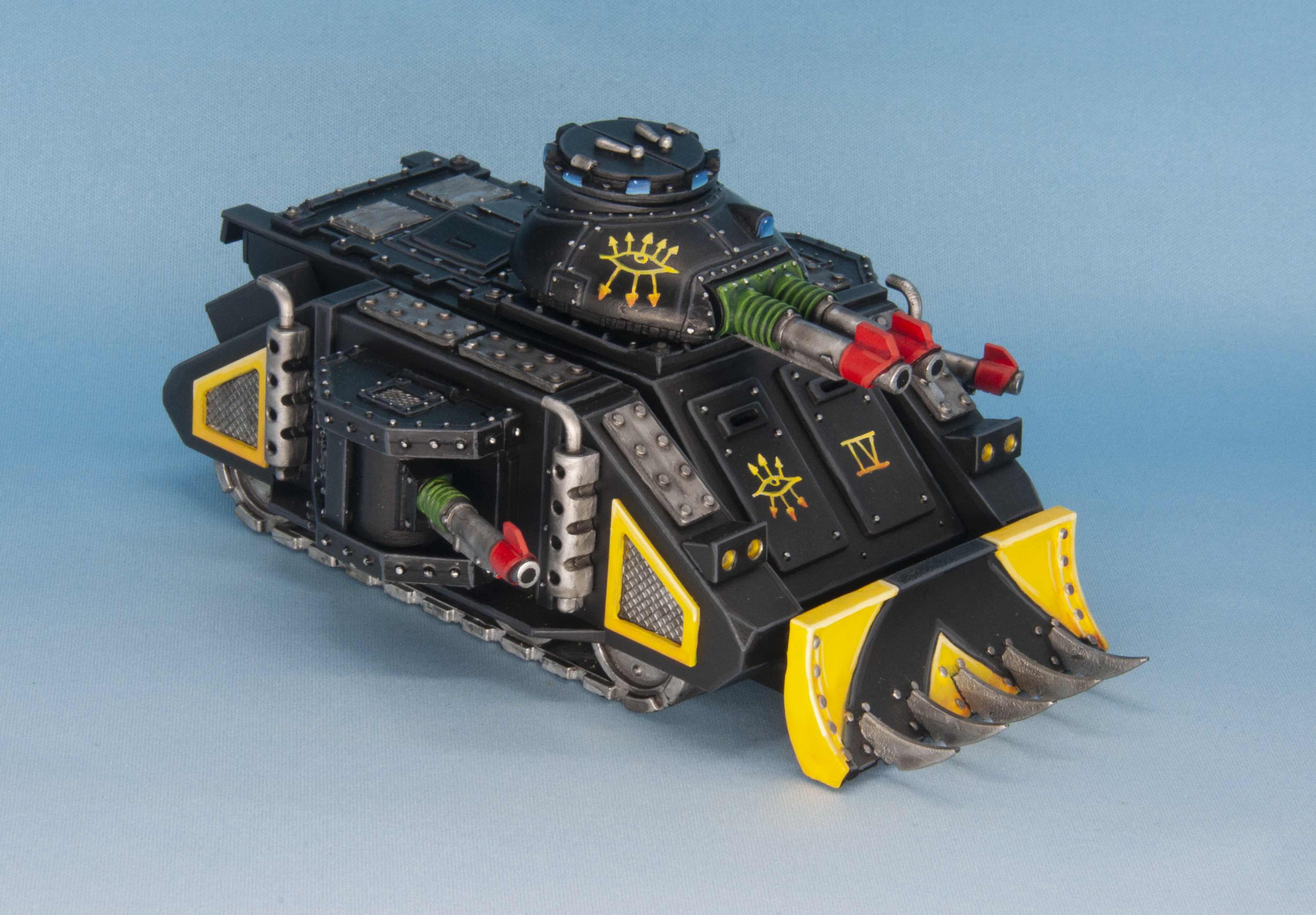 Again matching the codex, though a mix of Rogue Trader and 2nd Ed minis. The squad with bolters are less common and included in there is an unreleased Khorne marine body, who I equipped with a Heavy Plasma Gun. This was inspired by some Jes Goodwin concept art. The Rhino has Khorne icons added from the marine and daemon range and the large top piece is from the later Chaos Dwarf Hellcannon, though later, it fits in really well.