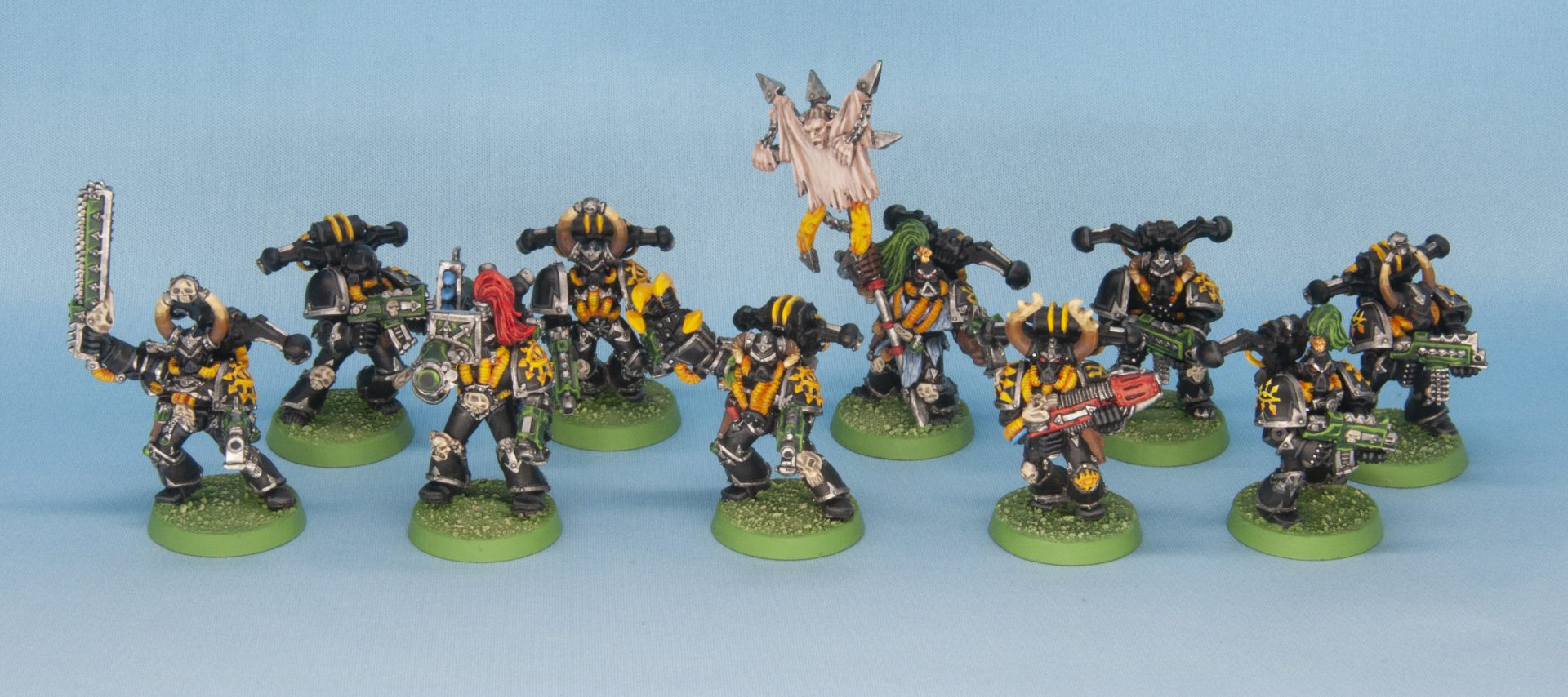 I put this army together between 2013-2018. I have more to add to it, notably missing are Night Lords and Noise Marines. I do have a couple more squads of Berserkers and Plague Marines to do, a Land Raider for Abandon to ride in and a properly Nurgled-up Rhino/Predator. I still play with them from time to time - my first game of 8th edition was with this army.