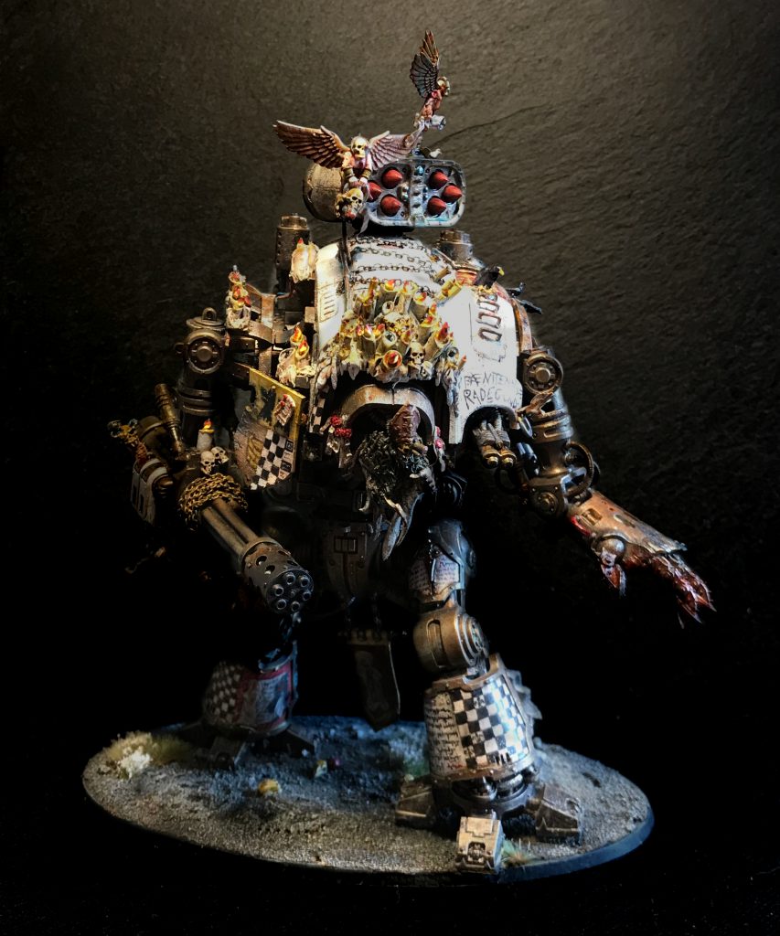 Knight Armiger. Credit: LenoonThe Penitent was made to the sound of that music, to memories of not knowing the words, and of my saesneg father mocking us, to every tin and clapboard church that wasn’t playing when we were out there getting murdered in 2020 and then the year when we kicked the shit out of the English in silence. The organ pipes are preposterously large, the weight of them pushing down into the body of the model which provides the bedrock for literally soaring music. Everything is uplifted in the service of the sound - the pilots (constructed from Sisters of Battle and Anvil industry bits) have hands thrown into the air, and exhort us to join in with a pointed finger. The servitor-reaper stands tall and proud, carrying - but not wearing - the bones of my ancestors in a high place of honour as it repeats and amplifies their music. I intended it as a hopeful little wraith, the transmutation of death into ancestry. If Sorrow was about rage, the strange zombie-powered pipe organ was hope, joy, and the sound of his voice. It strides forward, screaming forth a song, the Repentia literally carrying the torch, because by that point I’d run out of metaphors.
