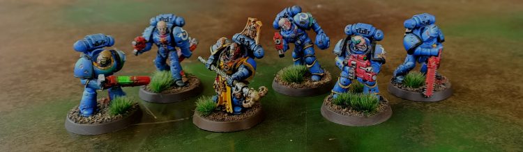 I built and painted this list as an exploration of the contrast between the new Primaris Marines and the Firstborn Marines. The Firstborn are all ragged, wounded, covered in battle damage and blood (and character/eccentricity), which is in stark contrast to the shining, unblemished armour of the Primaris, so new to the galaxy and as yet untested.