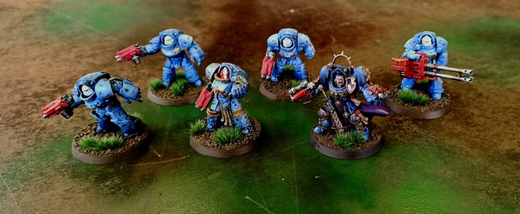 The narrative behond the army is taken from the fluff, apparently it was the Ultramarines 5th company (hence the black shoulder trim) that held back the forces of Nurgle as Roboute Guilleman slowly circled back to Ultramar (or specifically, the 'Spear of Espandor', the first time Firstborn Ultramarines fought alongside the Primaris) to end the Plague Wars. The army deploys as two tactical squads in various states of disarray led by a wounded Librarian (a nod to the classic story of Tigurius meeting the Legion of the Damned), representing a glorious last stand as these marines prepare to sell themselves dearly. Then, from Round two or so, all of the Primaris, Terminators and Death Watch arrive on the table (I hate to use the hackneyed term 'like an host of angels' but...) to save the day.