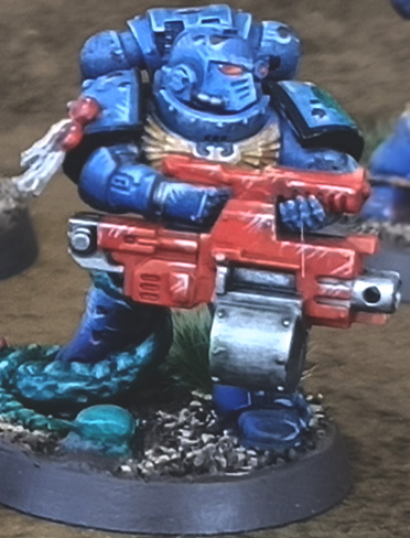 It's important to break up all of that blue with some other colours to provide strong contrast. This is why I went with the classic red bolters instead of the contemporary black ones (also as a homage to the mid-90's, 2nd Ed. Ultramarines I feel in love with). I also used judicious amounts of blood dribbling and streaking down faces and armour to help break up the blue. The basing, dark brown and a medium-high saturation green static grass are other colours that complement/contrast the blue without blending into it or having too high a contrast to it (also, it's easy to implement across an entire army consistently. Very important).