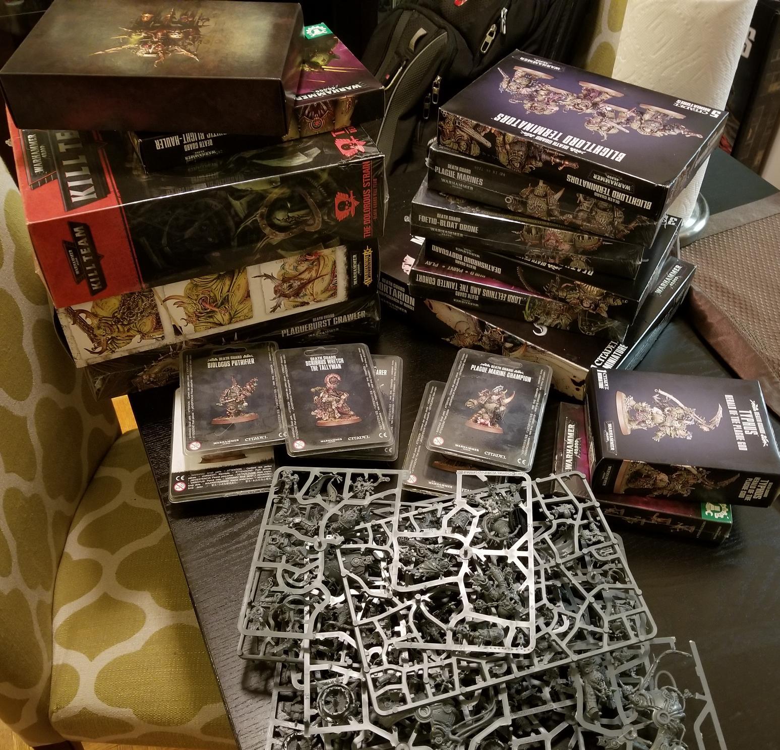 In that stack is a set of Dark Imperium Sprues, plus pretty much one of every Death Guard Kit, a Great Unclean One, and a Dolorous Strain Kill Team Elites kit. So basically, another two to three thousand points of stuff to paint, and that's before you figure that I'm gonna add one more Bloat-drone, a Myphitic Blight-hauler, two more Noxious Bilebringers, and two more Plagueburst Crawlers to the stack! Oh and also I just ordered a set of the new Wave 3 Space Marine Heroes minis that feature the Plague Marines because I don't want to have a single duplicate model in my Death Guard army because I've got brainworms. The good news is that Death Guard paint up faster that most models I've worked with, so I'm hopeful that I can get a good chunk of this done by the end of the year or early next year. and really put some work into culling my backlog. Then I'll just need to find shelf space to store all these beautiful new painted models...