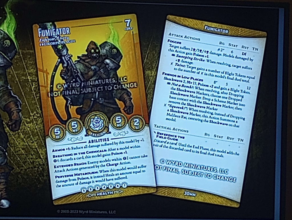 The Fogger itself is on balance a slightly better, but melee-only, version of the DCU's Flame/Plaguethrower, though the triggers are worse and it can only give Blight to its target rather than everyone hit. That's a bit unintuitive and also a bit of a shame, since otherwise this guy would have a niche as aoe Blight Spread. However, the Fumigator's ability to Reference the Field Guide ties the model together: you can build in any of those useful triggers at the low, low cost of a card, which incidentally gives him a Poison, which heals him, and so on, etc., world without end.