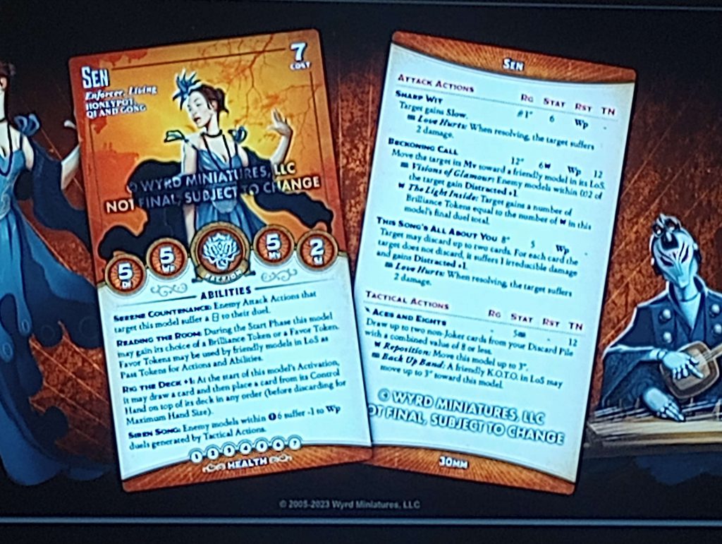 is the time period right for flappers? Credit: Wyrd GamesOur last new friend today is Sen (although she appears to have a friend of her own, off to the right there, probably the K.O.T.O. mentioned on her card). I've been vocal about my thoughts on Qi and Gong, and right from the start, Sen addresses one of them: the biggest issue with a crew that generates and spends Pass Tokens for effects is that the most powerful thing you can do with Pass Tokens is to, you know, pass activations with them. Favor Tokens solve that problem, and they let Sen interact with both of her crews' mechanics without having to stack too many rules on her front of card. Beyond that, she's got Serene Countenance for a little defensive boon (not too much - she's got bad stats and low health, so she will die if focused) and Rig the Deck because that's what Honeypot models have. Siren Song is a particularly interesting aura, because raw stat penalties in Malifaux are very rare (and powerful). This one's a bit limited since it only applies to Tactical Actions, but both of her keywords have Boring Conversation, and a Wp11 duel is quite a bit more disruptive than Wp10.