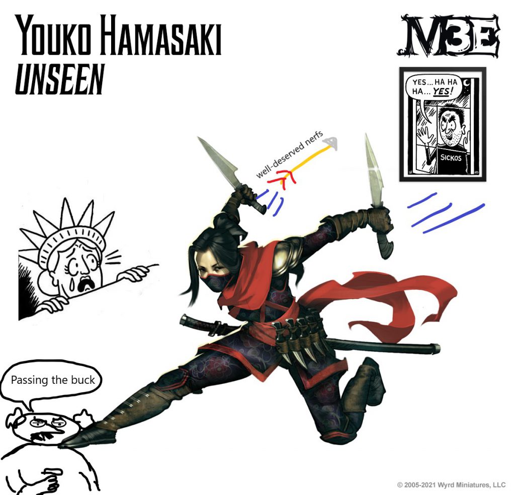 Somehow she still hasn't been nerfed, so I get to use this image again. Credit: Wyrd Games, Kelly, and MeSure, you can generate pass tokens with Biting Insult, but having to win a stat 5 opposed duel vs. an unactivated model is not reliable enough to be dangerous. Some pass token generation is fine - it just can't be as reliable as Frodsham, Jin Baccara, and other offenders.