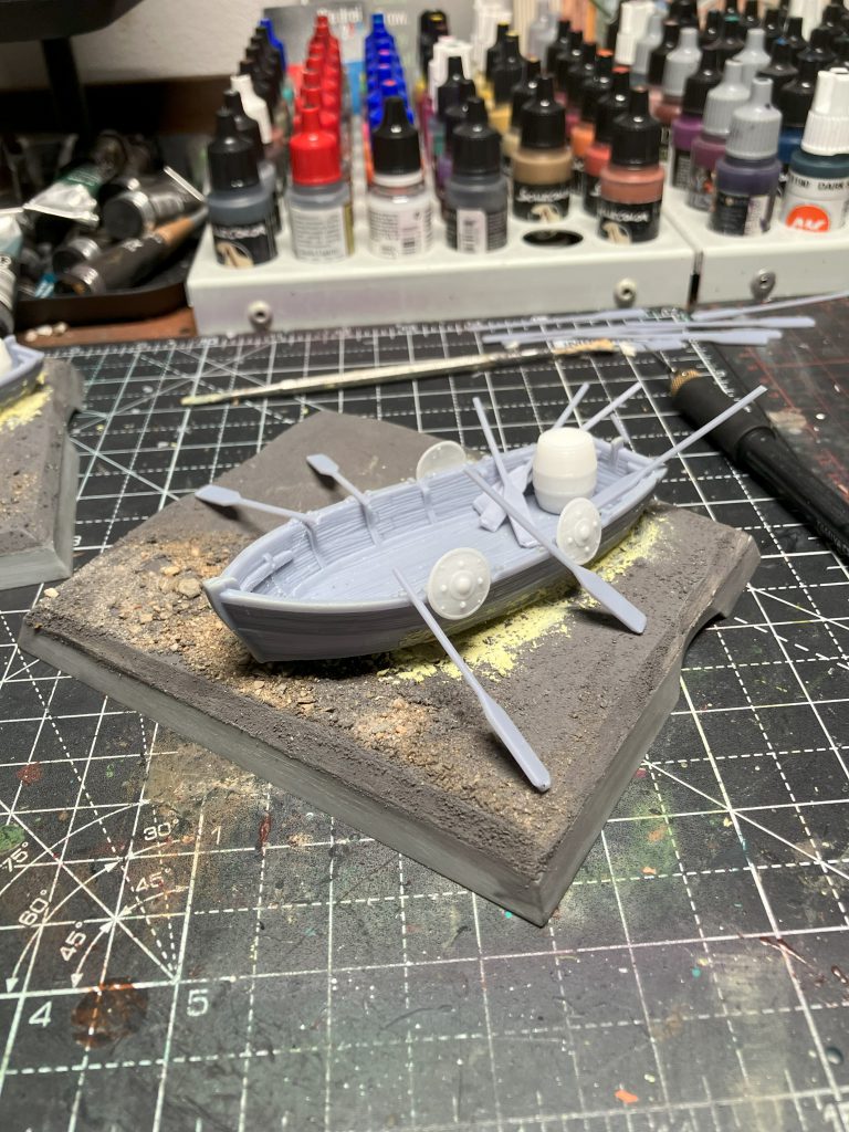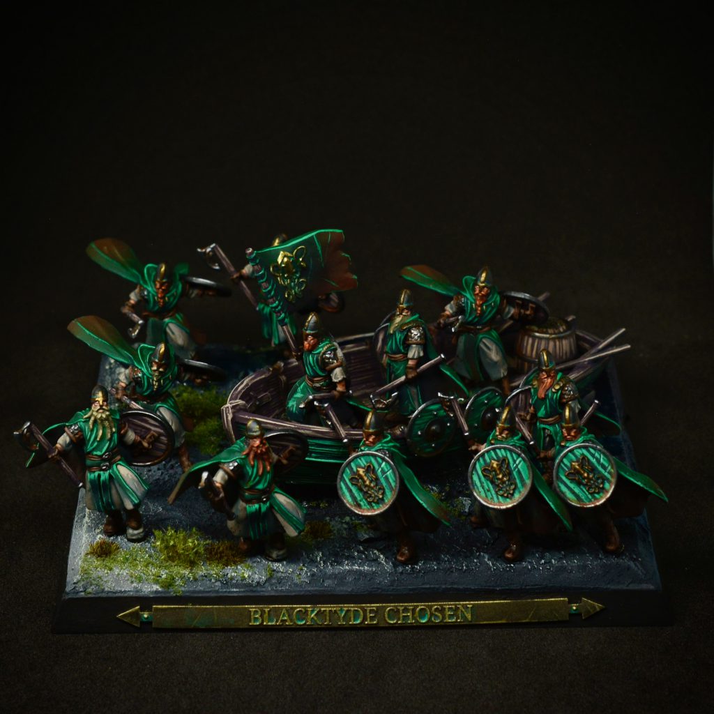 The artwork from the Blacktyde Chosen inspired me to build the scene with the boat. On the artwork, the Blacktyde Chosen stand inside the water and form a shield wall. So I created a scene in which the Blacktyde Chosen jump out of the boat, go ashore and form a shield wall against archers.