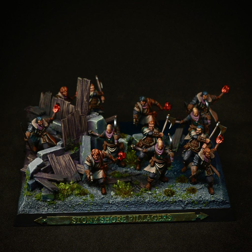The Stony Shore Pillagers have some models with torches. These models inspired me to create the scene with the house. The pillagers are pillaging and burning down houses, etc. so I included a burnt ruined house in this scene.