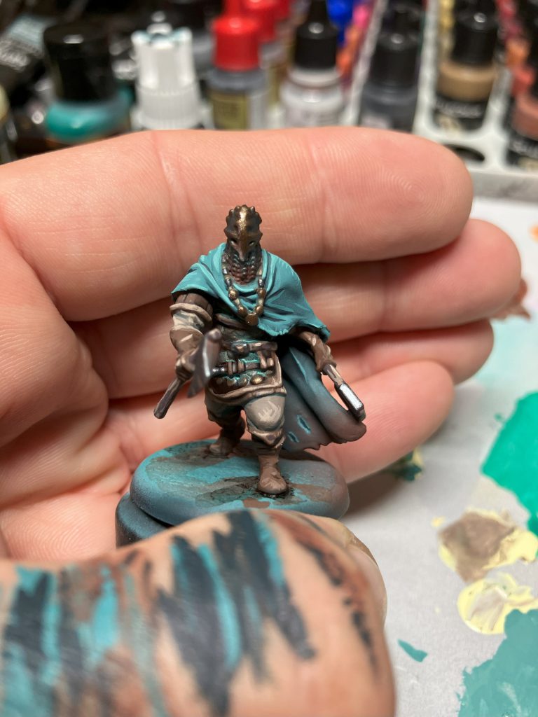 Skin - You could also mix blue into the shadows of the skin and work your way up to the skin midtone, but with the skin I want to have a nice contrast to the rest. This makes the skin pop more. Lots of warm colors, which is why I start here from a reddish brown and then work my way into a classic skin tone. A good base for a skin tone is Bugman's Glow from Citadel. From there I work my way with layering to Cork from AK. Later again for the highlights my yellowish white into the cork. Many people have problems with skin. I think that's because you start too bright. For example, with a "Basic Flesh Tone" as the first layer. Of course - it's written on the bottle! But then you have the problem that you can't highlight it properly anymore because it's already too bright.