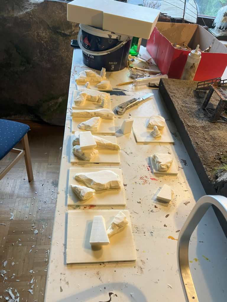 A buddy helped me here. Sigurd aka weltenbauer.club. He is an enthusiastic tabletop terrain craftsman and has a strong influence on me when building terrain. He also has a Styrodur cutter and a lot of Styrodur, so I asked him if he would like to help me. Sure - so we cut Styrodur first. 5 mm thick plates for the whole bases as a foundation. 5mm so that I could still sink magnets and the material does not bend too much. Then we carved rocks from Styrodur. Of course, we both cut ourselves.The Styrodur plates were glued to the trays, on top of which the stones were placed. So the rough shape was ready for the time being. I haven't thought about where the minis should be here. Then I primed everything with glue and paint so that the later colors adhere well to the styrodur. I threw sand and small stones into the wet paint-glue mud. That had to dry first.