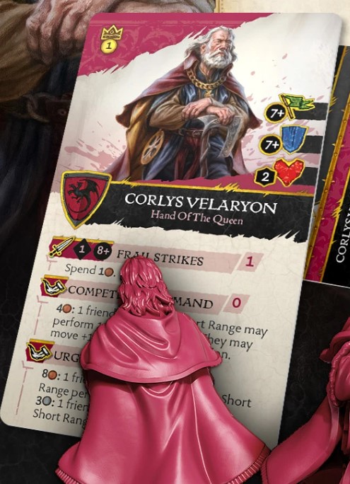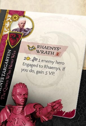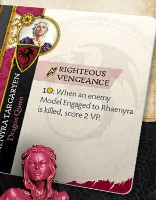 Motivation Design - You can spend 2 Gold to arrest a character engaged with Rhaenys gaining you a hefty 5VP for doing so. Arrest can happen if you can kill a model, and instead you choose to leave them on 1 Wound and take their model into custody. So, I imagine a play with Rhaenys is to get engaged, have another character kill an engaged enemy model, pop Motivation, then have Rhaenys push other models away. You could even follow this up with Corlys forcing a move on Rhaenys to safety as an example. But this outright captures them without an attack it seems, plus it gives 5VP which is the most we have seen for the value.