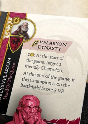 Motivation Design - Corlys is designed like Jon Arryn in the sense that to score the Motivation you need keep others alive until the end of the game. Jon Arryn gets more points due to the opponent getting to pick whereas Corlys gets fewer points for this Motivation as he gets to select the model. Honestly, it is weak due to the opponent knowing which Unit he needs to kill to deny you points from the get-go; on top of that it is only 3VP. The most likely choices are Daemon or Erryk for their survivability however like the other Champions they want to be in harms way. Perhaps a Neutral Champion that is tough to move would be best suited for this ability.