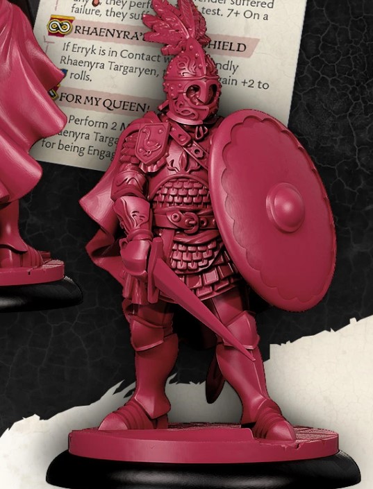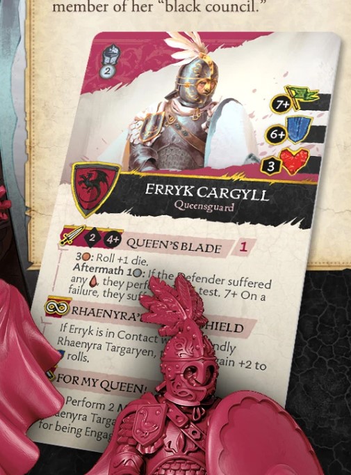 Rules Design - Erryk does have an edge over his fellow Queensguard Steffon with a better defence due to his shield and a much better attacking profile. He does bring a defence buff to Rhaenyra if he is nearby due to being her sworn shield and has another rule that is covered up but hints at performing some actions with Rhaenyra involved in this rule as well.
