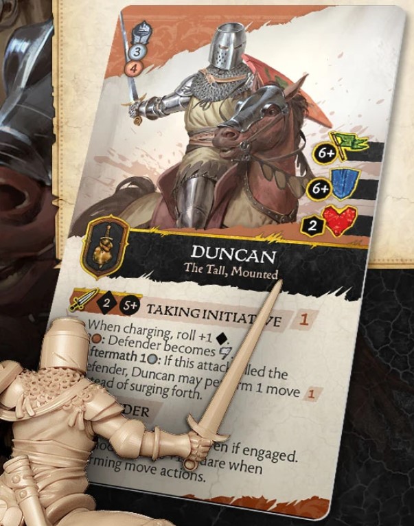 Credit: CMONRules Design - Between the Mounted and Foot variants of Duncan, the Foot version is the best one. You trade the mobility of the Mounted variant for a better combat and defensive ability. The Silver ability for combat that enforces a wound and a Routed condition after a Morale Test is incredibly strong and all players will be spending for that effect often. We can’t see what exactly the defensive ability does, but it gives Duncan multiple Aftermath abilities which could deter opponents from interacting with him giving Duncan more opportunities to utilise the powerful Melee Attack Action.
