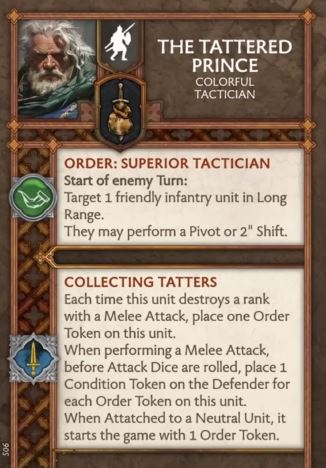 The Tattered Prince - Tactics Card - By Hits and CritsTattered and Twisty (Tactics Card) – Golden Company Elephants. This will be something that will come up with the NCU later, but the Assault Orders nerf meant that most sources of free attacks in exchange for a Tactics Zone are done at the lowest dice value. However, there is no negative change if it is used on a unit that sees little to no difference to the amount of dice; like a solo unit such as the Golden Company Elephant.