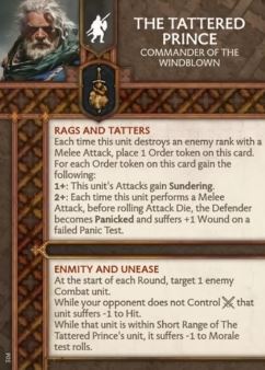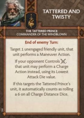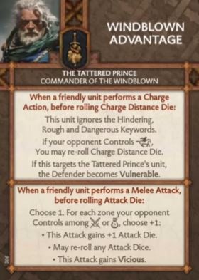 The Tattered Prince - Tactics Card - By Hits and CritsWindblown Advantage (Tactics Card) - This is a two option card with one option far stronger than the other. Reroll charges are nice but you will rarely use it especially since it is before rolling. I think more players will use it for the combat bonuses. Vicious could work well on Tatters if he is not in a Bolton unit, giving you more options to play with, however, I would be using this on the cavalry options since they all hit hard already and could all benefit from the options. Cavalry works well here.