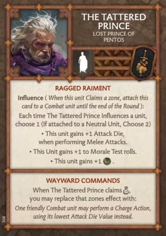 The Tattered Prince - Commander Card - By Hits and CritsRags and Tatters (Ability) - This ability allows Tatters to work in any neutral unit since it boosts their combat capabilities. It works better in one that already has morale modifiers such as any of the Bolton forces. I can see him working well inside of the Bolton Cutthroats, but if you have a few points to spend, then why not throw him into the Bolton Bastard’s Girls? He is an aggressive commander after all. The morale focus here relates to him being intimidating on the battlefield due to the reputation of the ragged raiment. Enmity and Unease (Ability) - There really aren't many abilities like this one, with the closest being Knightly Vow due to it targeting a unit for some reroll charges. This causes some debuffs that work well in some certain circumstances. The -1 to morale again works well with Bolton forces, with the -1 to hit working well almost anywhere, but works even better when Bloody Mummer Skirmishers and Bolton Blackguard are getting into combat. Overall, I think this is a decent commander in the game, but a fantastic commander in the neutral faction especially since one just comes with a keyword and that’s it. I do think he isn’t as good as the attachment version or the NCU version, but he does come with some tactics cards which could change my mind.