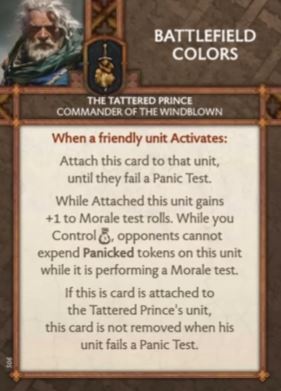 The Tattered Prince - Tactics Card - By Hits and CritsBattlefield Colours (Tactics Card) - Neutrals used to have a big problem with morale since 7+ is a death sentence and most of their options have this morale value as standard. But recently there have been tweaks to this and there are cards to reroll or auto pass. However, you don’t want to waste these cards on cheap 5pts units even though you would like to shorten up a weakness. This card fixes that, especially for Tatters’ unit. Bolton Cutthroats would be perfect for this card and we have already mentioned them as a good option for Tatters. A very useful card to keep Neutrals in the game for longer.