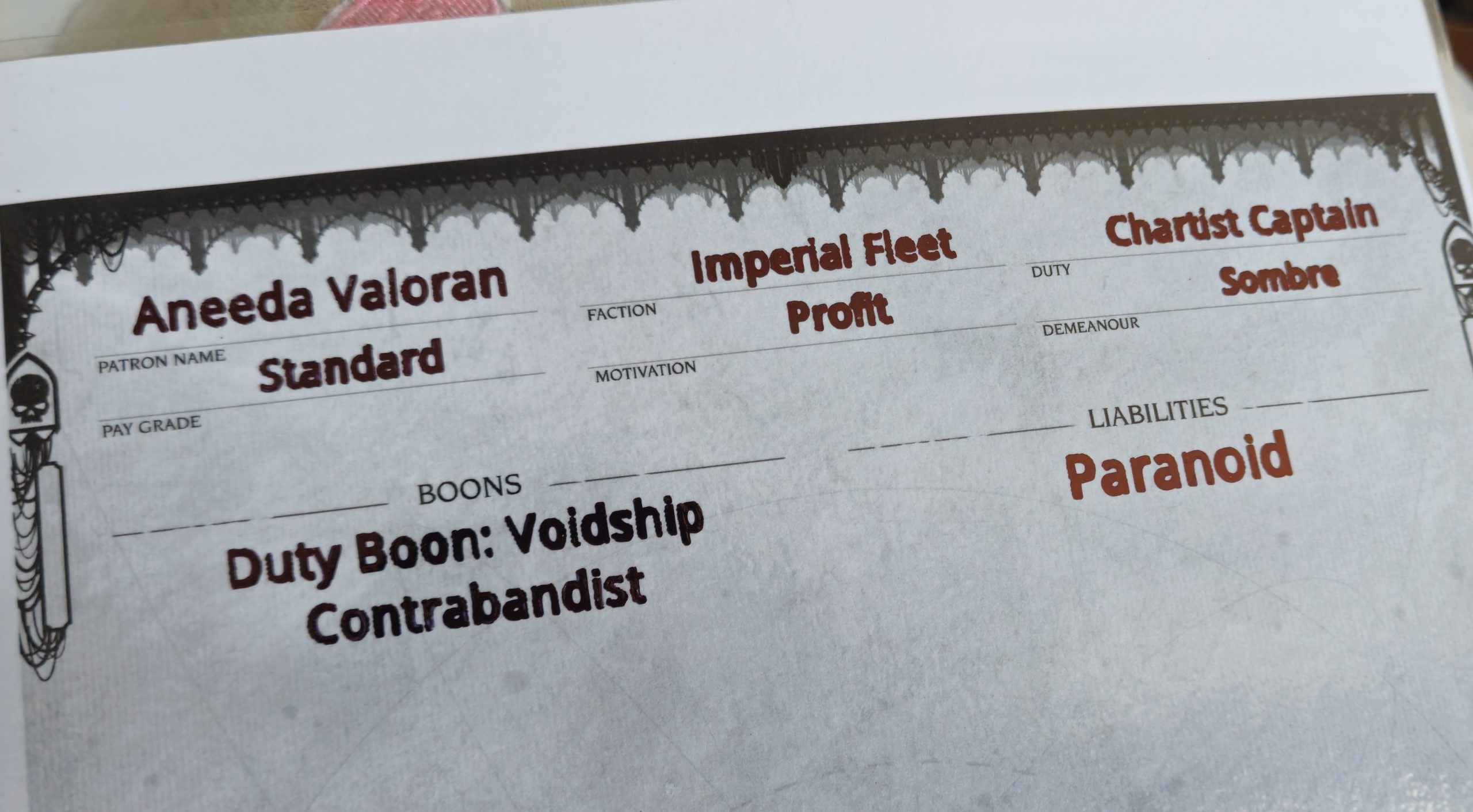 The pen plotter was the more intuitive of the two tools. I ran a number of test projects using SVGs (my designs and located online), and I found the accuracy to be very satisfactory. The only downside was that each time the pen plotter runs, it places a dot in the work area as some kind of pen-and-material pressure calibration. This dot was always placed somewhere the pen would draw over anyway, but it might be partially visible if your project is especially detail-sensitive. My results ended up quite good. The most interesting one was my use of the pen plotter to fill out a Patron Sheet for the Warhammer 40,000 Imperium Maledictum roleplaying game. Anyone who has tried to use a sharpie neatly on a laminated sheet knows the horror that quickly ensues. Well, I'm happy to report that this slightly odd use case was very successful. My campaign's Patron Sheet has perfectly neat writing. After the initial success, I re-ran it with a permanent marker fitted into the toolhead and it looks great.
