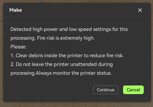 A conspicuous warning is raised when starting laser jobs with settings that increase fire risk.