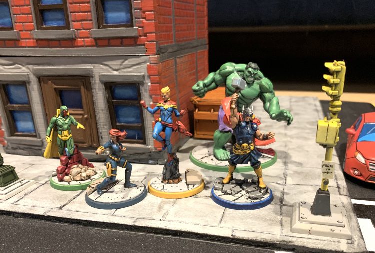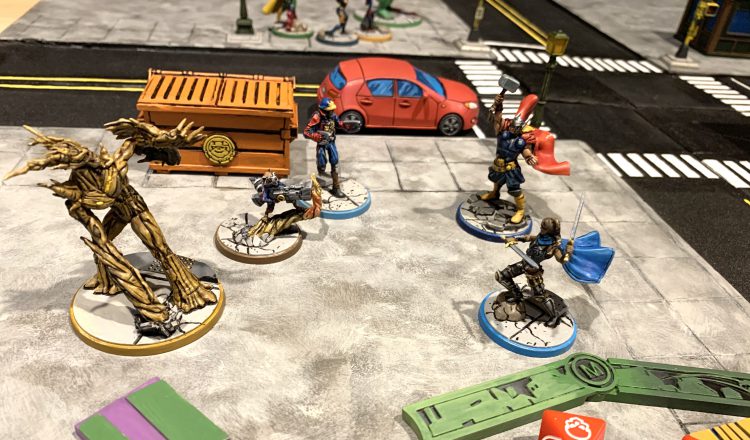 You mentioned the terrain that comes in the starter. There’s actually a decent amount of that even if it’s not all that exciting. A couple cars, a couple dumpsters, a newsstand, and four lamp posts. Oh, and a tiny garbage can. But the coolest thing about the terrain is it’s all throwable and destructible. It doesn’t do a huge amount of damage compared to other attacks but there is very little more satisfying than throwing dumpsters at Iron Man. I do wish being hit by a dumpster or a whole building knocked characters back but there’s a ton of board control and movement shenanigan powers in the game, which is really key seeing how much is dependent on holding certain positions.