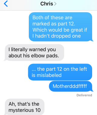 And then I got to Zemo. Mother. Fucking. Zemo. Anyone who’s put together these models knew I was leading up to this. This dude has a separate fur piece that attaches to his jacket for no discernible reason, a sword arm that really didn’t need to be two pieces at all, and elbow pads that were designed by an absolute sadist. There’s no reason for them to be separate from the arms, they’re incredibly tiny (so dropping one was a special kind of joy), and best of all the assembly instructions aren’t even labeled in the booklet and you have to go online to see the labeled version anyway and the online version is mislabeled.