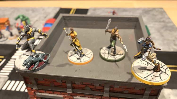 But A) the building Iron Man is on does not itself block LoS, meaning he can’t move back from the edge and hide; and B) all ranges are measured horizontally, as if the terrain were two dimensional. So Spider-Man, who has a normal punch range of 2, can walk up to the edge of that building and as long as Iron Man isn’t more than range 2 away from the edge Spidey can punch him, even though Tony is like four stories up. Ponderous.