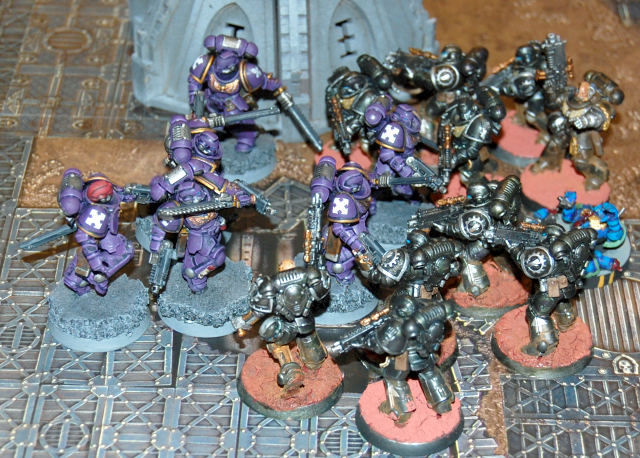 <Receipt acknowledged. Analyzing. Astartes power armor, mixed models and forms. Coloration: purple and gold. Altered Imperial Fists iconography.> Tyrides paused a picosecond, calculating. <Seventy-eight percent likelihood these are Saints Penitent, Imperial Fist offshoot chapter. Twenty-two percent possibility these are traitorous marines of the Emperor’s Children.>