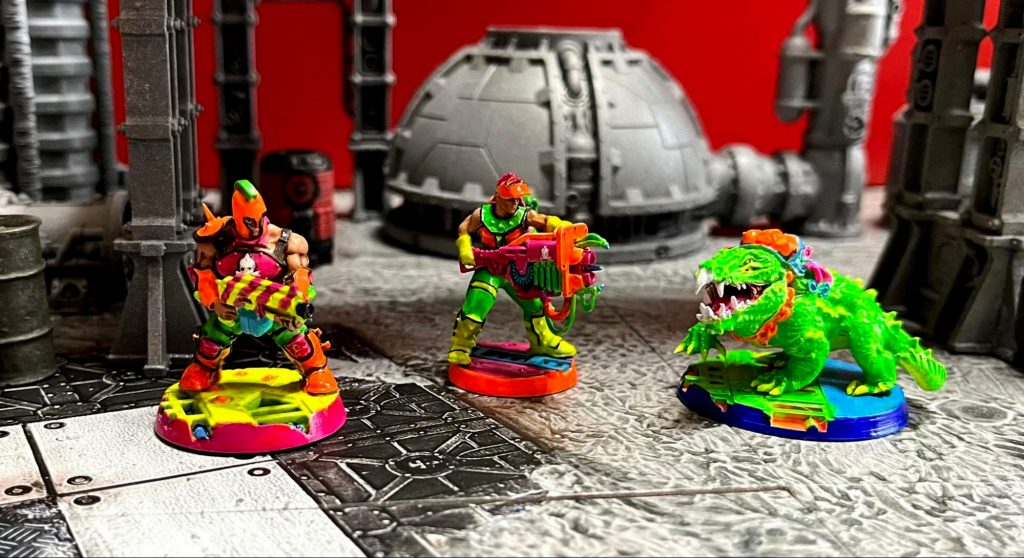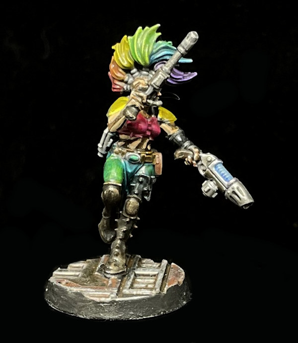 Of course, with all of that thought of theme in mind, execution turned out to be a bit of a fuckup. I started with the en grisaille method, which is a fancy French way of saying “gray underpainting” (and definitely not Sl*p Ch*p, a phrase which would earn me a brutal bollocking back at Goonhammer Central Headquarters and Shitposting Manufactorum). I then hit all of that with various types of Contrast, using Doomfire Magenta as the neon pink element common to all of the gang. Unfortunately the grisaille really dulled down the blinding neons that I had hoped for in the pinks and hair but in the end I’m still happy with the results.