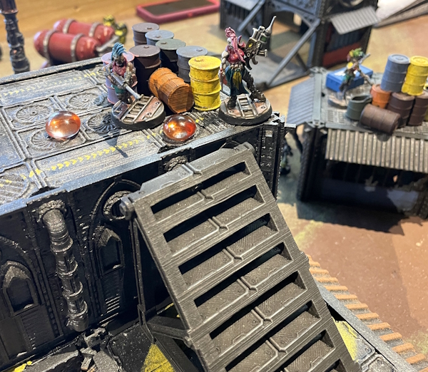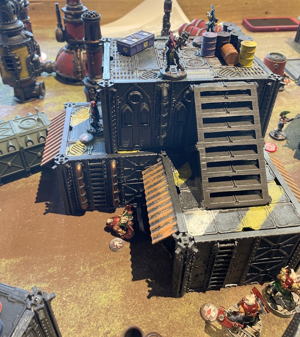 Would you be shocked if I told you that things went very badly for both of us in two completely different ways? You shouldn’t be, since that’s pretty much the story of every shooting force taking on a melee force since forever. I did a great job of shooting the Corpse Grinders to pieces but Robuchon's Corpse Grinders Cult Icon meant that he and all his pals within shouting distance got a little extra movement every turn and before you know it they were up on top of the two-story and in the middle of the board making Escherloaf. Unfortunately for the one on the ground floor this is about when the smoke cloud evaporated and he realized he was surrounded" frameborder="0"> by Eschers with plasma pistols and chem-throwers.