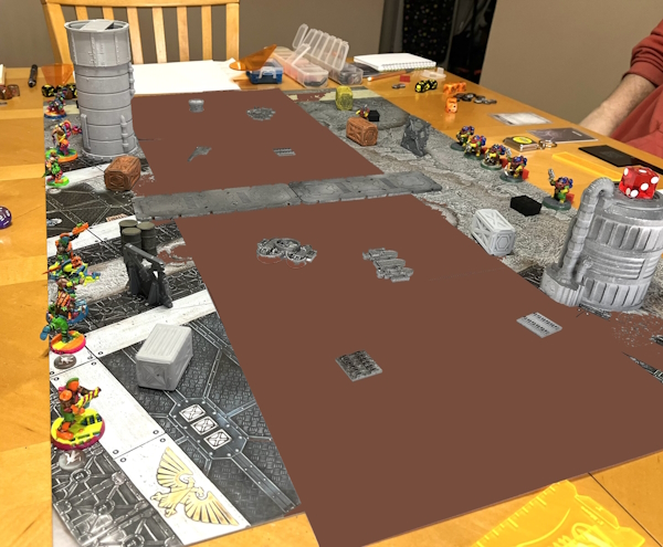 We didn’t assemble quite as thematic a terrain setup for this as you did and I feel slightly bad about that but my disappointment was blunted by the realization that we had to build our own battlefield. Last time we showed up and someone had left a pretty great Necromunda table already set up; this time we arrived at the tail end of a Magic release event so the tables had been cleared off which left us to our own devices. Folks, I should go on record here with an incredibly “hot” take: the concept of player-placed terrain can drink hot diarrhea out of my ass (and I will eat the One Chip Challenge ahead of time to make it worse for all parties involved).