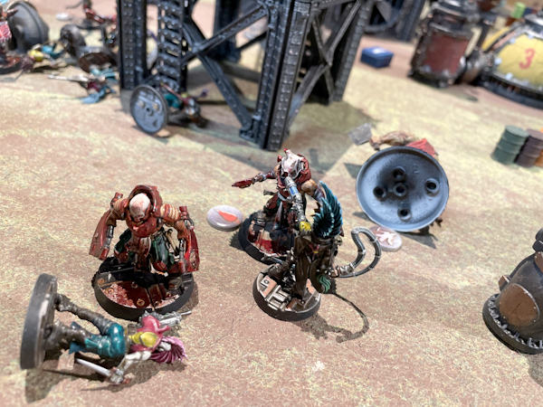 The meltagun was at the top of my “stuff what has to die now” list, but immediately behind him was Josh’s other Champion with an Ironhead boltgun, Obsidian. Fortunately for me he was up on a platform and in range of Craw’s Blaze-inducing combat shotgun. Obsidian made his Initiative check to not fall off the platform but was on fire and promptly ran off the platform. He survived the fall but spent the entire game running around on fire. It was maybe the only joy I had all day.