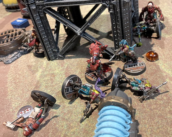 My takeaways from this game are a) fire bad; and b) I will never, ever remember to play the Last Gasp tactics card when I have it, enabling a fighter to shoot or make a melee attack when they are taken Out of Action. I think this is the third game where I’ve completely failed to play this tactic, in case you were wondering exactly how bad I am at this game.