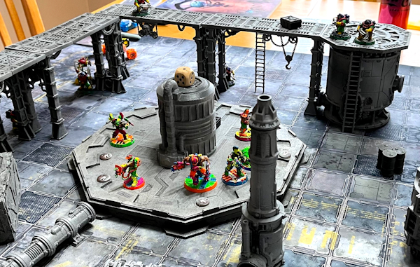 Terrain was also not my friend, because we had set up a big semicircle of gantry around the gunk tank, upon which Josh’s Squats could stand and rain fire down upon me. Fortunately the only thing more deadly in Necromunda than an unobstructed line of sight is falling from high places, so at least I had that going for me.