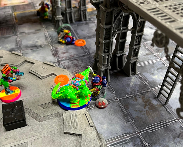 CHRIS: SIXTY CREDITS!! People at first assumed it had to be a typo and should be “160,” which would still be a bargain any day of the week. First activation out of the gate, Josh’s Drill Master (Champion) unloaded his almost-as-bullshit Rapid Fire 1 meltagun into Mumps, sending him immediately Out of Action. So much for that new scope. Eventually I would shoot the Drill Master, causing him to fall off a platform and land on Pizz, who then took care of business.
