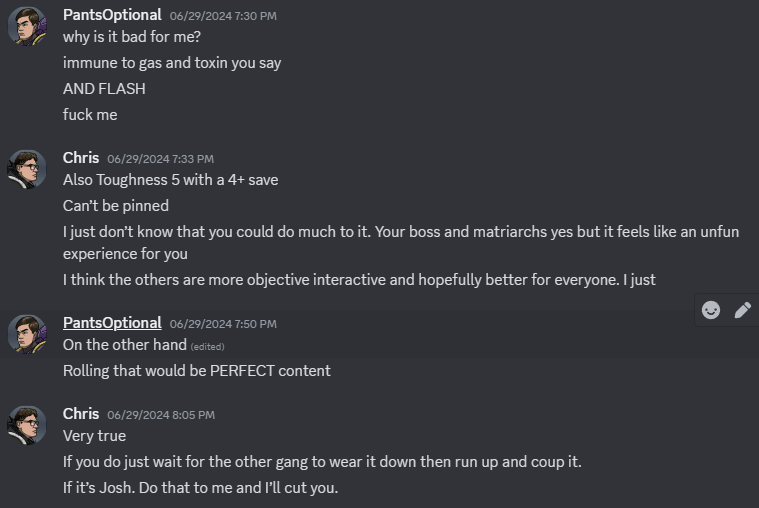 CHRIS: I fully concur, but please note you are still a dick for a cornucopia of other reasons. When I sent around the list of missions for this week, we both realized Murder Cyborg would be a not great experience for you. The titular cyborg has Toughness 5 and is immune to Toxin, Gas, and Flash. It basically exists as a giant “fuck you” specifically to Eschers. I figured my Goliaths would have a better chance with it but for you it could be extremely frustrating.