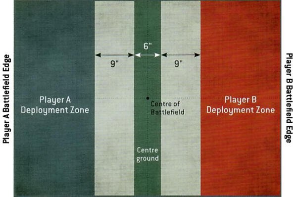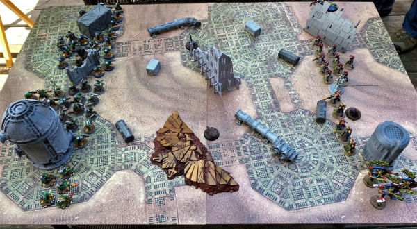 Sweep and Clear deployment map. Credit: Games Workshop.DREW: In terms of the narrative, the Salamanders arrived on Vordanis Tertius in search of clues to help them piece together what happened here and answer distress calls from the surface. This planet once held an Adeptus Mechanicus Research Station (Diodatus VI) that burgeoned on becoming a full Forge World, but obviously something terrible happened since “smoking ruin” is the hot new architectural style. While the Salamanders hunt for supply caches for the survivors they come across a Black Legion scouting force out to taint the supplies both physically/spiritually and with scrapcode.
